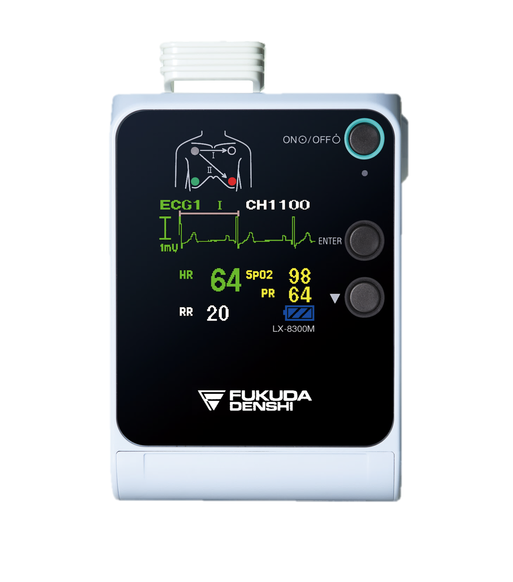 The LX-8300 is a telemetry transmitter that can measure ECG, RESP, and SpO2 while being compact and lightweight. Each measurement indication is laid out efficiently in colours on the screen.
